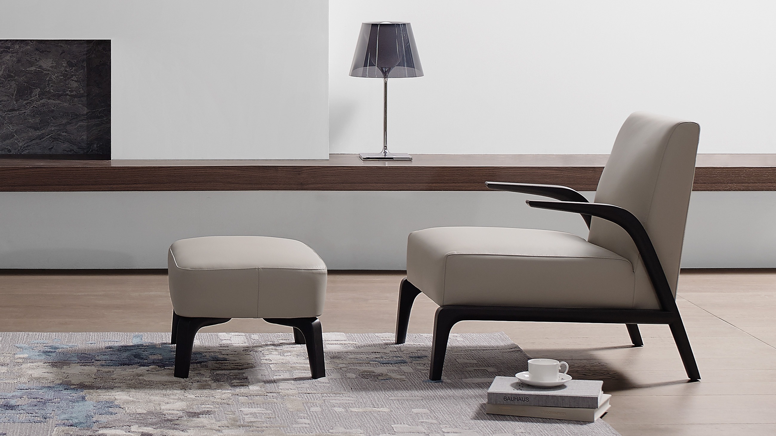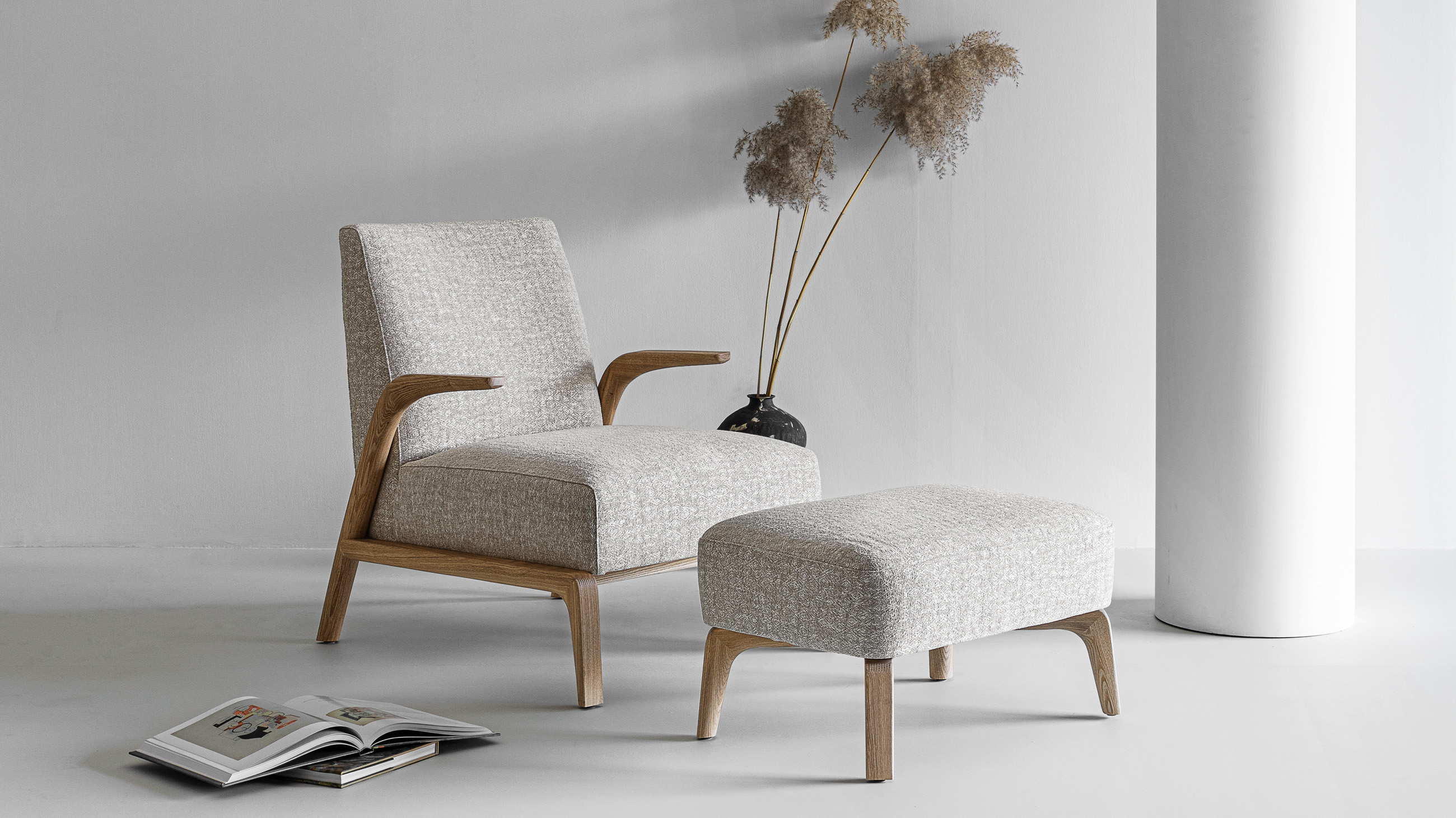 悬空的实木扶手如风中的柳叶般舒展开来,与厚实舒适的坐感相映成趣。